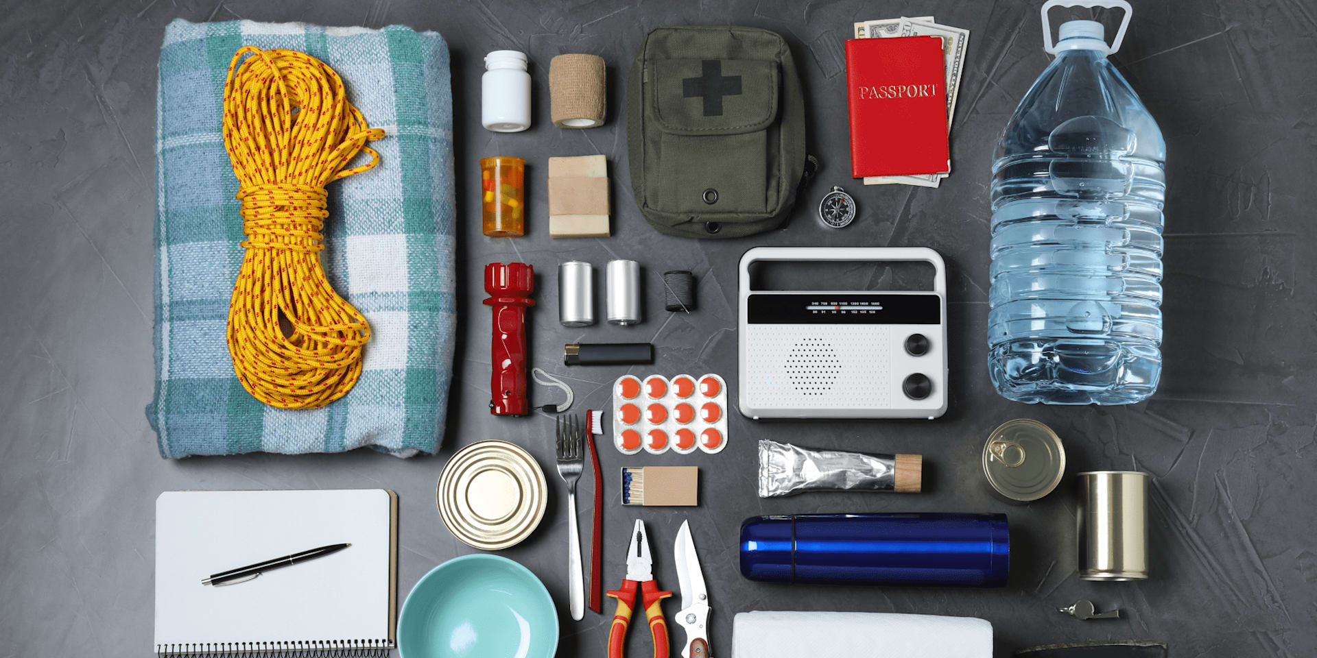 - Multitool with wrench/pliers to turn off utilities and a can opener for food